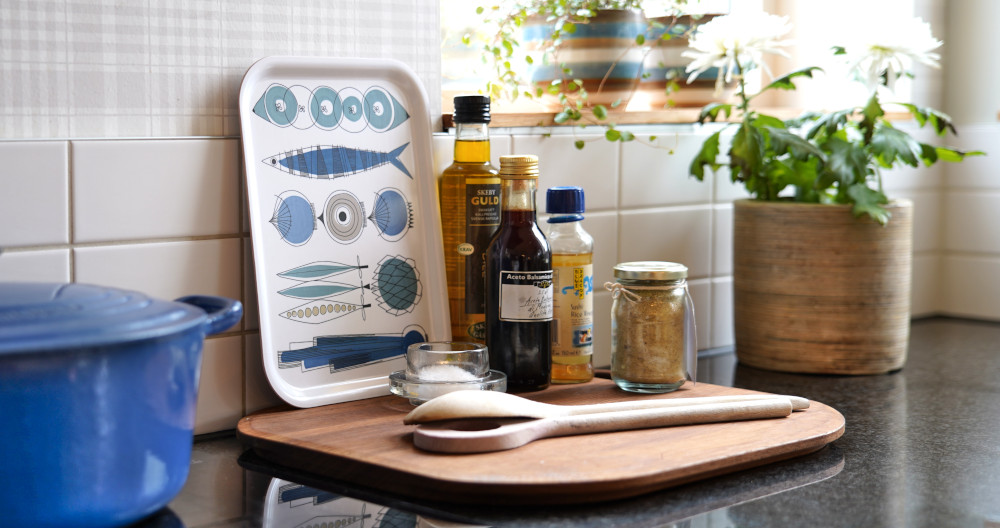 Bake, grill and cook with a Picknick blue beige apron, potholder and oven glove. They are important in the kitchen and at the same time nice interior details.