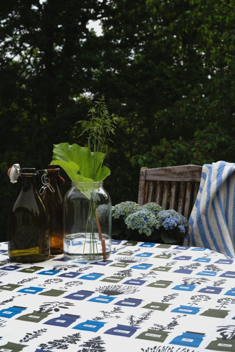 Persons kryddskåp, oil cloth is a wipeable oil cloth in half linen that is easy to clean with a damp cloth. The tablecloth is made of cotton and treated with a water-repellent surface to resist spills and stains. It has a thin coating of acrylic (not PVC).