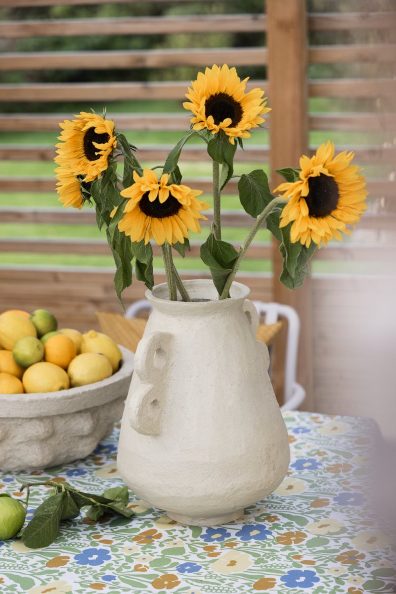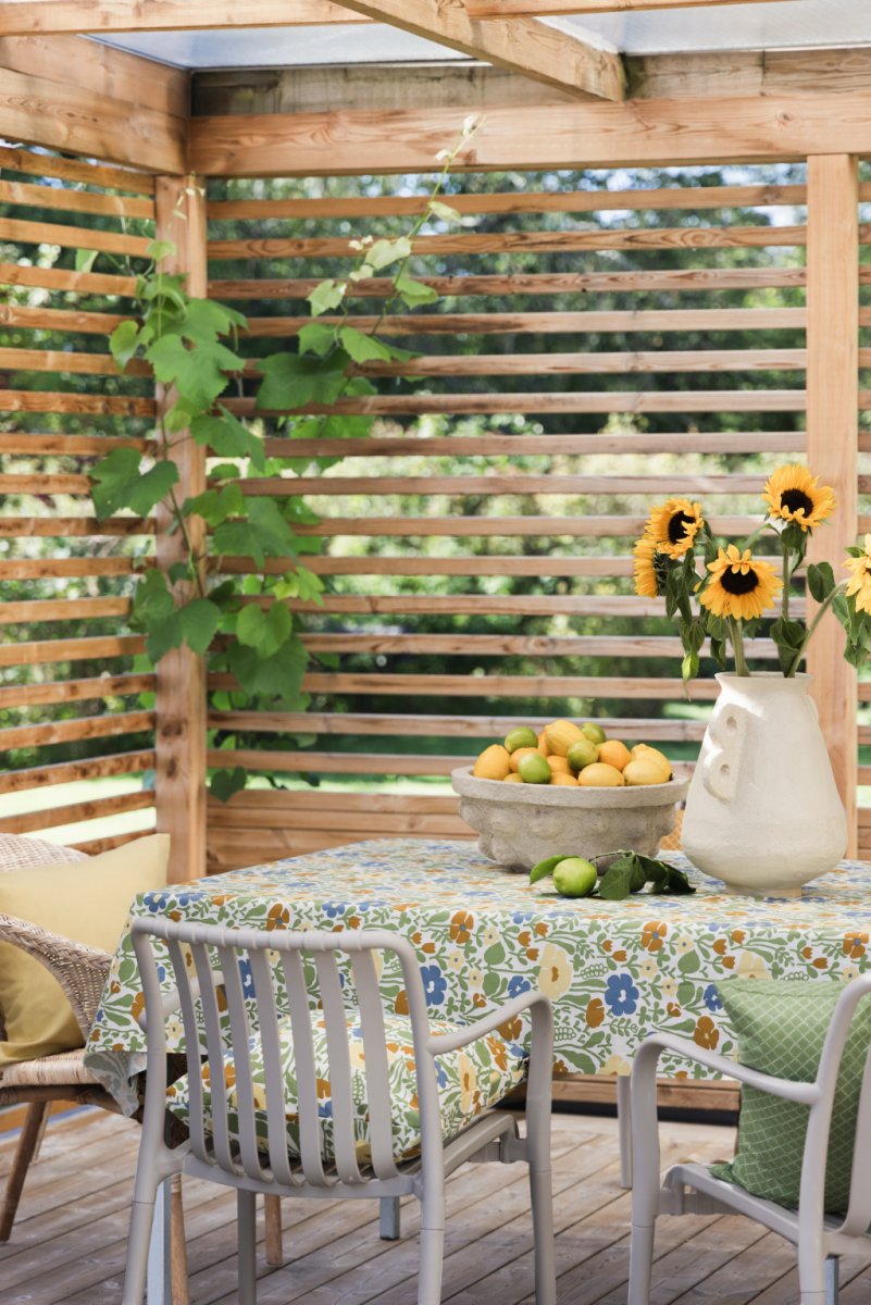 The oilcloth is made of cotton and treated with a water-repellent surface that resists spills and stains. It’s easy to wipe clean with a damp cloth and has a thin acrylic coating (non-PVC), which makes it flexible, more environmentally friendly, and able to retain its textile feel.
